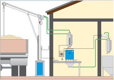 Rakorafs 取樣器能快速簡單得從室外拖車上抽取有效的的樣品。當拖車還在地秤上時,樣品已經被抽取了。裝有取樣管的伸縮臂的能夠自由伸縮和350度范圍的轉動,并且可以垂直升降。當取樣管下降到樣品中,由于向下的壓力,樣品被推到取樣管內部,并通過鐵管和塑料管被送到室內稱樣收集器中。收集器中樣品和空氣分離,風箱和氣壓的作用使得其中的空氣流回。