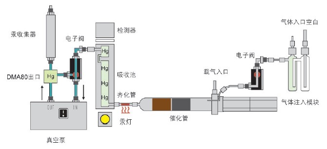 氣體附件包由注射模塊和真空抽氣泵組成,真空泵帶動地體樣品通過DMA-80的催化管、齊化管和檢測器進行檢測。